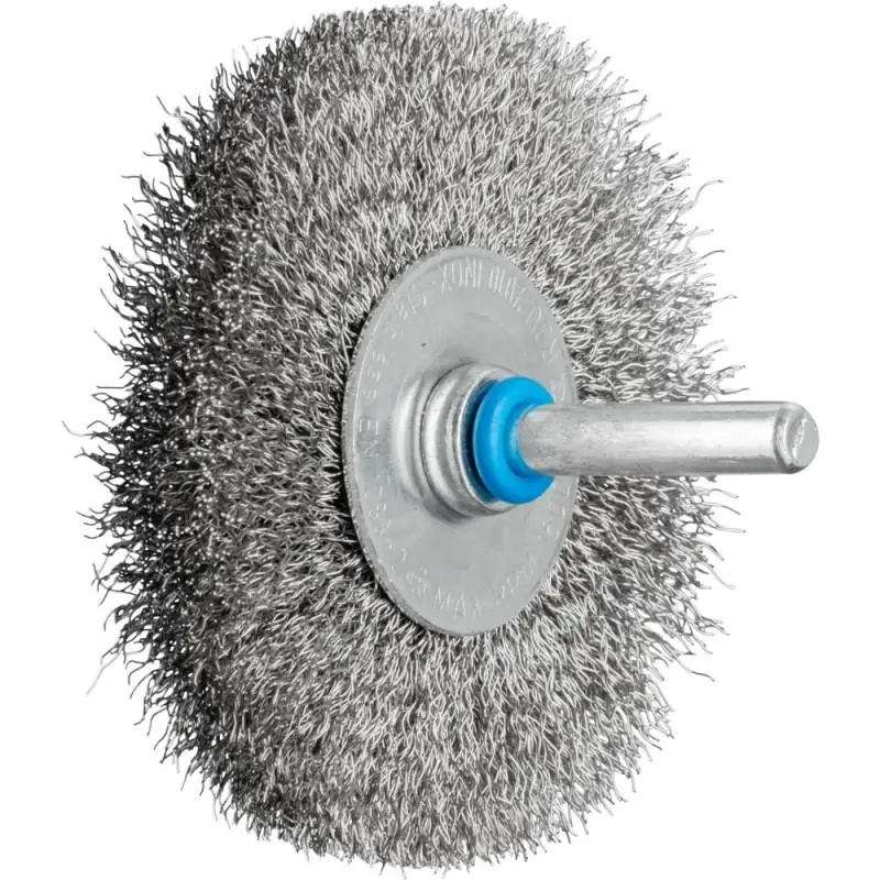 The PFERD Crimped Bevel Brush KBU 70x10 mm is designed for medium-duty brushing tasks such as deburring, cleaning, and derusting. It features a 70 mm external diameter, 10 mm width, and a 6 mm shank diameter, making it compatible with various power tools. The brush is equipped with 0.2 mm stainless steel (INOX) wire filaments, each 15 mm in length, providing flexibility and durability. The wire quality 1.4310 (V2A) ensures excellent corrosion resistance and optimal tool life. Suitable for use on all stainless steels (INOX), including V4A, the brush operates at a maximum speed of 15,000 RPM, with optimal performance between 6,000 and 9,800 RPM. It is color-coded in blue to indicate its suitability for stainless steel applications. The brush is degreased to prevent oil residue on the workpiece and is highly flexible, enabling optimal adjustment to the workpiece contour. It provides access to hard-to-reach areas such as inner edges, grooves, and keyways, creating fine surfaces. The stainless steel wire withstands temperatures up to 450 °C.
