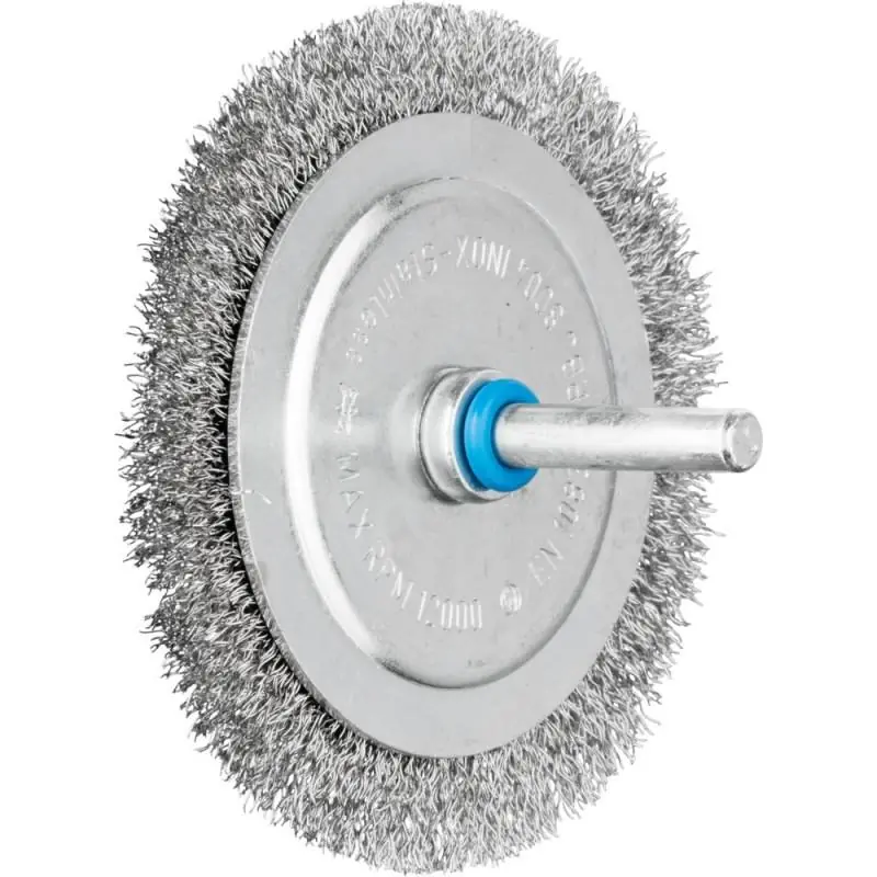 The PFERD 8004/6 INOX 0.20 Round Brush with Shaft is designed for versatile applications, including cleaning, derusting, smoothing, polishing weld seams, light deburring, and removing corrosion and paint. This brush is particularly effective on stainless steel (INOX) surfaces, utilizing wire quality 1.4310 (V2A) to ensure excellent corrosion resistance and optimal tool life. All PFERD brushes with INOX filaments are color-coded in blue and are suitable for use on all stainless steels (INOX), such as V4A. The wire quality 1.4310 tends to become ferromagnetic when cold-worked; i.e., it can be attracted using magnets. This change in microstructure does not impact the quality and corrosion resistance of the INOX filament, which remains resistant to corrosion. Stainless steel wire (INOX) withstands temperatures up to 450 °C.