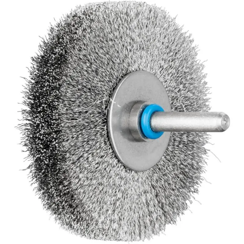 The PFERD INOX-TOTAL Wheel Brush Crimped RBUIT 70x15 mm is designed for cleaning, deburring, derusting, and removing heat discoloration. It features a 70 mm external diameter, 15 mm width, and a 6 mm shank diameter. The brush is equipped with 0.15 mm stainless steel (INOX) wire filaments, each 19 mm in length, and has a total length of 50 mm. It operates optimally between 6,000 and 9,800 RPM, with a maximum speed of 15,000 RPM. The brush is suitable for use on materials such as aluminum, bronze, cobalt-based alloys, hard non-ferrous metals, high-temperature-resistant materials, nickel-based alloys (e.g., Inconel and Hastelloy), nickel or titanium-based superalloys, other non-ferrous metals, soft titanium alloys (tensile strength up to 500 N/mm²), stainless steel (INOX), titanium, and titanium alloys. The brush is degreased to prevent leaving oil residues on the workpiece and is color-coded in blue to indicate its suitability for stainless steel applications.