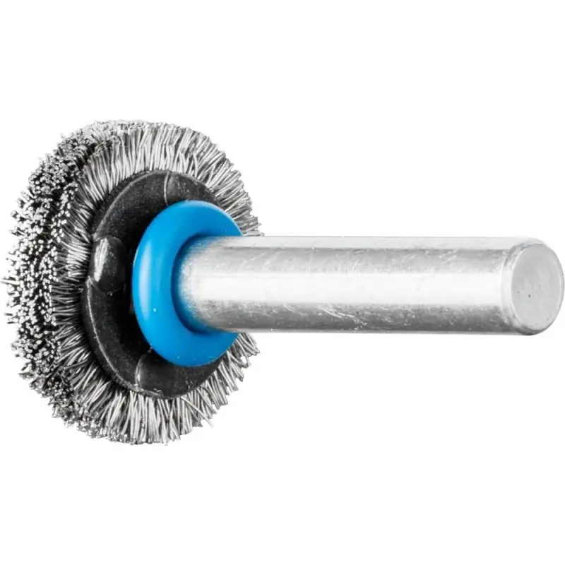 The PFERD Round Brush with Shaft, Unknotted, RBU 2004/6 INOX 0.20, is designed for versatile applications including cleaning, derusting, smoothing, weld seam cleaning, light deburring, and the removal of corrosion and paint. This brush is particularly effective on stainless steel (INOX) surfaces, utilizing wire quality 1.4310 (V2A) for enhanced corrosion resistance and optimal service life. The wire material is stainless steel (INOX), which can withstand temperatures up to 450°C. The brush features a shaft diameter of 6 mm and is suitable for use with tool drives of at least 300 watts. The recommended operating speed ranges from 8,000 to 13,000 RPM, with a maximum permissible speed of 20,000 RPM. The brush dimensions are as follows: