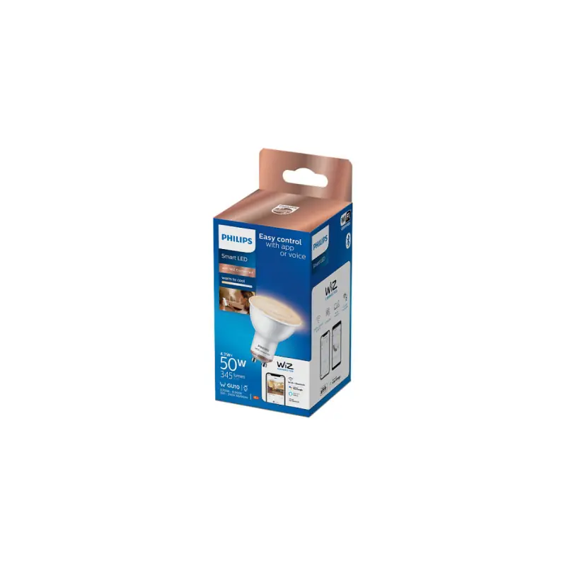 PHILIPS Connected LED Spot Bulb - WIZ - EyeComfort - Dimmable - 4.7W - 345 Lumens - GU10 - 93209 this high-brightness smart bulb offers various shades of warm or cool white light. The GU10 bulb is the most commonly used modern lighting solution to replace a halogen reflector. Use the Wiz app to control it or your voice by connecting it with Amazon Alexa, Google Assistant, or Siri shortcuts. Installation is extremely easy; simply plug in your new lamp, download the Wiz app, and you're all set! You can then manage your light remotely, including turning it on, adjusting the brightness, and creating automatic lighting scenarios. The bulb is also designed for your eye comfort (see the attached EyeComfort document below), allowing you to illuminate your home comfortably.
