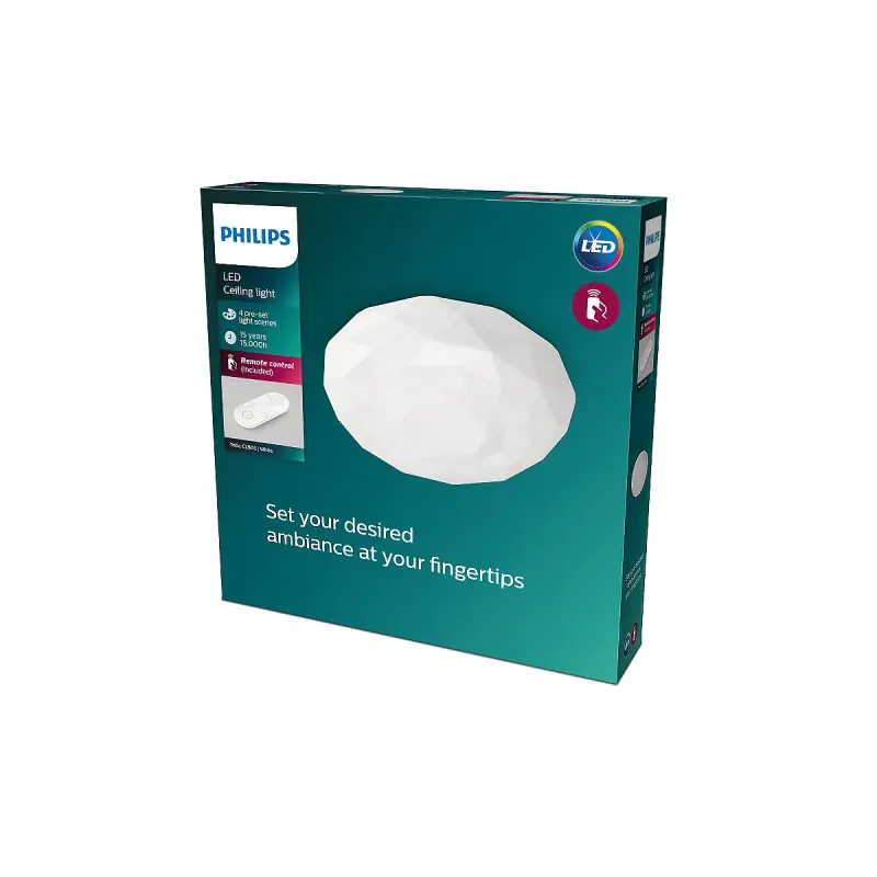 With this PHILIPS LED remote-controlled ceiling light - EyeComfort - 36 8cm - 23W - dimmable - 93536 choose from a wide range of lighting colours, brightness levels, and predefined light settings with just a few clicks on the remote control. Switch from a bright white light that helps you focus to a warm yellow light conducive to relaxation. You can also help the little ones fall asleep with the soft light of a night light. A standby mode is also available, and the light will automatically turn off after 60 minutes. You can control up to 3 units using this powerful and smart remote control. Finally, the ceiling light is designed for your eye comfort (see the attached EyeComfort document below) so you can comfortably illuminate your home.