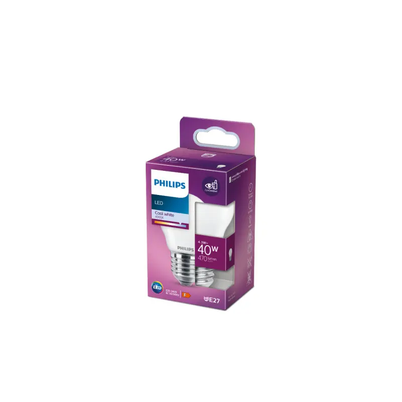 PHILIPS spherical LED bulb - EyeComfort - 4 3W - 470 lumens - 4000K - E27 - 93015 with a contemporary style, it is ideal for replacing traditional incandescent bulbs in decorative fixtures such as chandeliers or floor lamps. Thanks to LED technology, the bulb uses about 85% less energy and lasts ten times longer than traditional bulbs. Now you can comfortably light your home with LEDs designed for eye comfort(see the attached EyeComfort document below) and thus create the perfect atmosphere for your home.