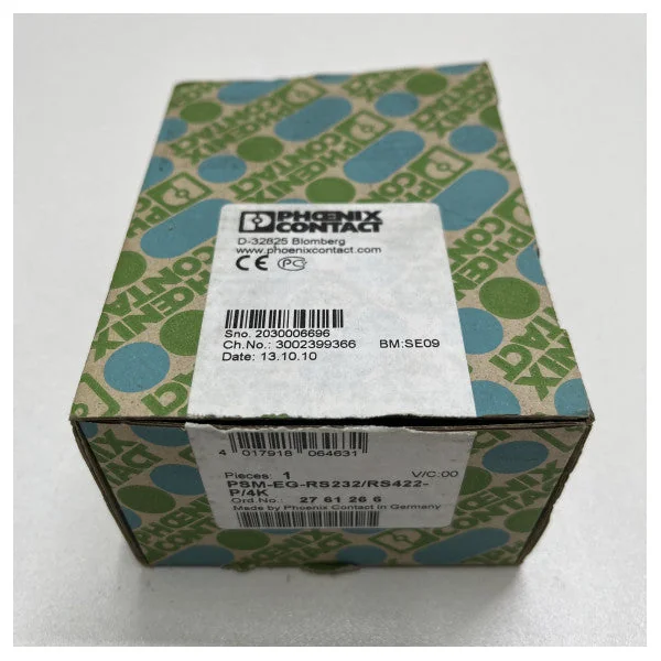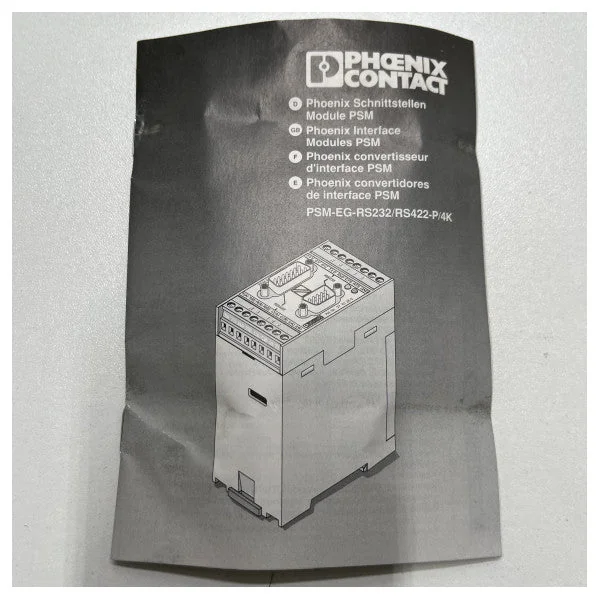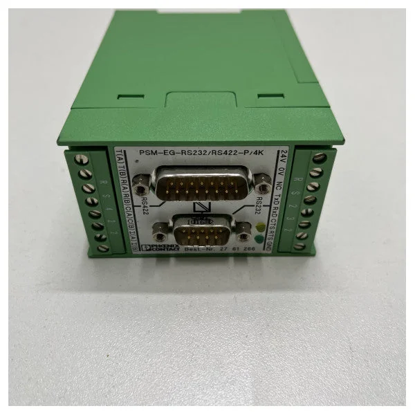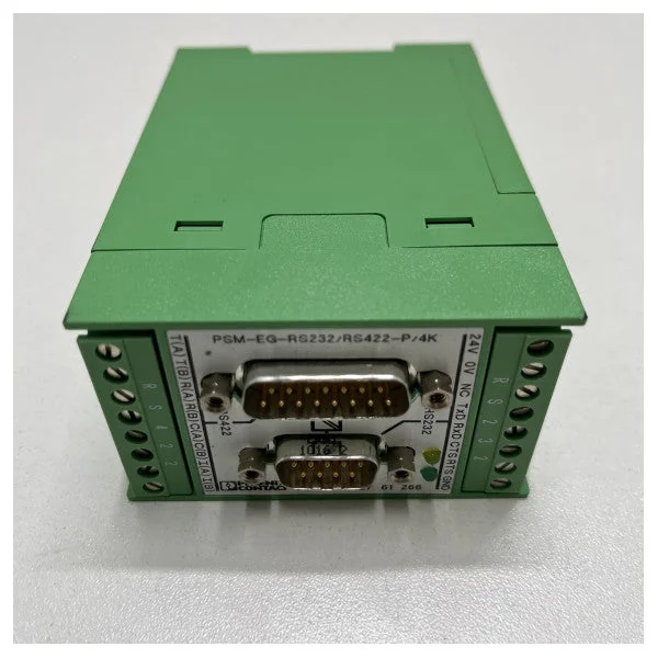 Phoenix Data Converter PSGM-EG RS232/RS422-P/4K: Product Description The Phoenix Data Converter PSGM-EG RS232/RS422-P/4K is a compact and powerful data converter that converts RS-232 signals to RS-422 signals. This enables devices using RS-232 to connect with devices that use RS-422, thereby increasing communication distance and reliability. Features: RS-232 to RS-422 conversion: Converts RS-232 signals to RS-422 signals for compatibility with a wide range of devices. 4-channel: Supports up to four independent RS-422 channels for simultaneous communication with multiple devices. Galvanic isolation: Provides 3-way galvanic isolation between the power supply, RS-232, and RS-422 for enhanced safety and reliability. High transmission speed: Supports data rates of up to 64 kbps for fast and efficient data transfer. DIN rail mounting: Easy installation on DIN rail for reliable and space-saving mounting. Surge protection: Built-in surge protection safeguards devices against damage from voltage spikes. Specifications: Supply voltage: 24 V DC Current consumption: 200 mA Transmission speed: 300 bps to 64 kbps Isolation voltage strength: 2.5 kV Ambient temperature: -40°C to +70°C Dimensions: 115 x 64 x 22 mm Applications: The Phoenix Data Converter PSGM-EG RS232/RS422-P/4K is ideal for a wide range of applications, including: Industrial automation Building automation Security systems Point-of-sale systems Data centre management Test and measurement equipment Benefits: Increases communication distance Enhances the reliability of data transmission Provides galvanic isolation for safety Supports high data rates Easy installation