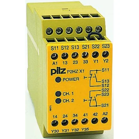 EN574 (type III C). PILZ P2HZ X1, Two Hand Monitoring, Type IIIC. The P2HZ X1 series of Safety Relays by PILZ offer you affordable and reliable feedback control loops, specifically designed to handle the monitoring of your external relays or contactors. Features and benefits. Specially designed for two handed control/operation. The P2HZ series will not function unless the operator has their hands outside the danger zone area during hazardous movement. LED indicator for switching your channel status from 1 to 2 and also to monitor your supply voltage Single or Dual channel input operation (Single channel are used more beneficially with smaller type machines where you need to use a dedicated logic device that only has a small function to cut off in an emergency – Dual allows you to take control of more safety circuits and control a greater amount of control zones at any given time) Reactivation: The outputs will no re-energise unless both operator elements have been released and then re-operated simultaneously. Suitable for DIN rail mounting Durable and has an extended service life vs. competitors. Safety features. The relay will provide the circuit self-monitoring. The safety functions of the device remain in effect even in the case of component failures. The relay will prevent the circuit from further press strokes in the case of, relay failures, contact welding, coil defects or open/short circuits. Applications. Mechanical presses Hydraulic presses General safety circuits (in accordance with EN 60204-1). Technical safety parameters. EN 60204-1 EN 954-1 EN (IEC) 62061 EN ISO 13849-1 IEC 61511 – SIL 3