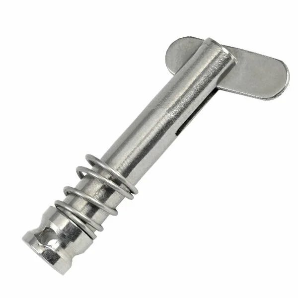Stainless steel pin with spring, for awning canopies with spring-loaded folding tab.