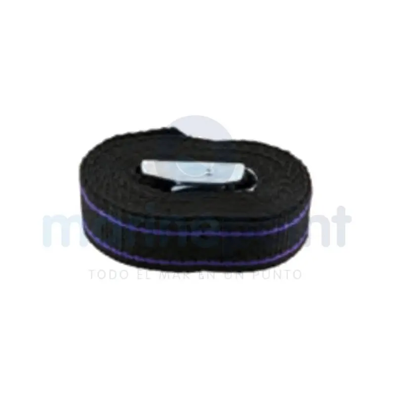 Durable 2.5m black strap tie-down with steel closure for secure fastening.