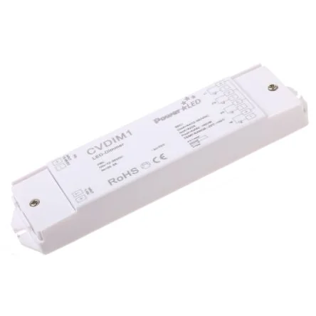 PowerLED CVDIM1 4 channel 1-10V LED Dimmer. The CVDIM1 1-10V LED dimmer, from PowerLED, can be connected between a LED driver and LED lighting modules to provide dimming control for indoor lighting. With a single 1-10V input and 4 PWM output channels, the CVDIM1 LED Dimmer can be used with constant voltage 12-36VDC LED devices. 1 x 1-10V input channel: 4 x PWM output channels Input/output voltage: 12 - 36VDC Load current (max.): 4 x 5A Output power: 4 x (60 – 180)W Operating temperature range: -20 to +50°C