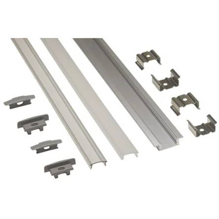 PowerLED Aluminium LED Strip Mounting Channels. A range of aluminium channels for mounting flexible LED strips. Supplied in 1 metre lengths together these channels can be cut to length or linked together to make longer runs. Perfect for under cabinet, shelve, cove or skirting lighting. 6 models available: EXT1 – ; 797-2432 797-2432 Low Profile, Surface Mounted Aluminium LED Light Strip Channel Supplied with: 1 clear ; 1 opal diffuser, 4 end caps, 6 mounting clips EXT2 – ; 797-2441 797-2441 Deep Profile, Surface Mounted Aluminium LED Light Strip Channel Supplied with: 1 clear ; 1 opal diffuser, 4 end caps, 6 mounting clips EXT3 – ; 797-2444 797-2444 Recessed Aluminium LED Light Strip Channel Supplied with: 1 clear ; 1 opal diffuser, 4 end caps, 6 mounting clips EXT4 – ; 797-2448 797-2448 Corner Mounted LED Light Strip Channel Supplied with: 1 clear ; 1 opal diffuser, 4 end caps, 6 mounting clips Nautilus – ; 136-0225 136-0225 Standard Profile Aluminium LED Light Strip Channel (For use with Nautilus Strip – ; 890-4512 890-4512 ) Lineo – ; 136-0226 136-0226 Tall Locking Profile Aluminium LED Light Strip Channel (For use with Lineo Strip – ; 890-4506 890-4506 )