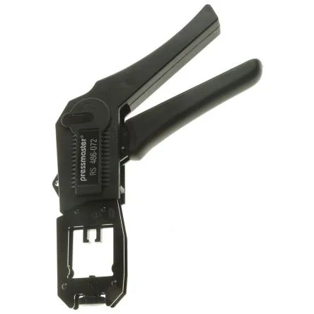 For correct termination only use the die set specified for each plug stock no. Part number. Part number ; 455-214 455-214 non-keyed 8/8 die set Part number ; 464-915 464-915 keyed 8/8 die set. Multi-purpose Crimp Tool. A multi-purpose steel frame crimping tool for terminating AMP and Western Electric Style data plugs in all the popular configurations. Employing a parallel action jaw closure, the tool will accept any one of the die sets using a very simple thumb screw lock located at the front of the jaws. The tool has a ratchet action crimping cycle, with quick release should jamming occur. No setting is required.,Providing a durable and consistent termination the tool is supplied (without die sets) either on its own or in a strong plastic carrying case. The case includes compartments to store up to 4 die sets. Instructions for crimping are included. The die set for shielded plugs is included with shield termination kit stock no. 455-242.
