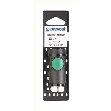 Euro Standard Pneumatic Couplings. A range of pneumatic quick connect safety couplings and adapters from Prevost S1 series. Compatible with European profile 7.2 - 7.4 mm fittings. The S1 series disconnects and safely decompresses with one button and incorporates an aerodynamic valve seal design to prevent leaks and optimise airflow. S1 series pneumatic couplings can help reduce energy costs and increase productivity by eliminating any significant pressure loss and dramatically reducing downtime and maintenance. Features and Benefits. • Ergonomic shape. • Non-slip surface allows firm grip. • Lightweight and compact size. • Abrasion, corrosion and crush resistant. • Compatible with European Profile 7.2 - 7.4mm couplings. • Simultaneous decompression and disconnection. • Colour coded for easy identification of profile. • Flow rate 1820 L/min @ 6 bar. Applications. • Assembly lines. • Automotive. • Mechanical manufacturing. • Machine workshops. • Printing Industry. • Textile industry. • Wood and plastics industries. • Technical education