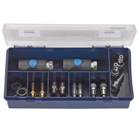 ISO B6 Couplings Kit. ISO B6 couplings kit from Prevost. Compatible with US MIL 4109 and ISO 6150 profile B fittings. The S1 series disconnects and safely decompresses with one button and incorporates an aerodynamic valve seal design to prevent leaks and optimise airflow. S1 series pneumatic couplings can help reduce energy costs and increase productivity by eliminating any significant pressure loss and dramatically reducing downtime and maintenance. Features and Benefits. • Flow rate 833 L/min @ 6 bar. • Ergonomic shape. • Non-slip surface allows firm grip. • Lightweight and compact size. • Abrasion, corrosion and crush resistant. • Compatible with ISO 6150 B6 and MIL 4109 couplings. • Simultaneous decompression and disconnection. • Colour coded for easy identification of profile. Kit Contents. • 2 G1/4 BSP female threaded connect couplings - ISI 061101. • 2 G1/4 BSP female adapters - IRP 066101. • 1 G1/4 BSP female adapter with sealing cone - IRP 066101 AE. • 2 R1/4 male adapters - IRP 066151. • 2 adapters for 8 mm ID hoses - IRP 066808. • 2 G1/4 BSp male threaded joiners for 8 mm ID hose - JFT 1408. • 2 ear clamps - 1315. • 2 ear clamps - 1517. Applications. • Assembly lines. • Automotive. • Mechanical manufacturing. • Machine workshops. • Printing Industry. • Textile industry. • Wood and plastics industries. • Technical education