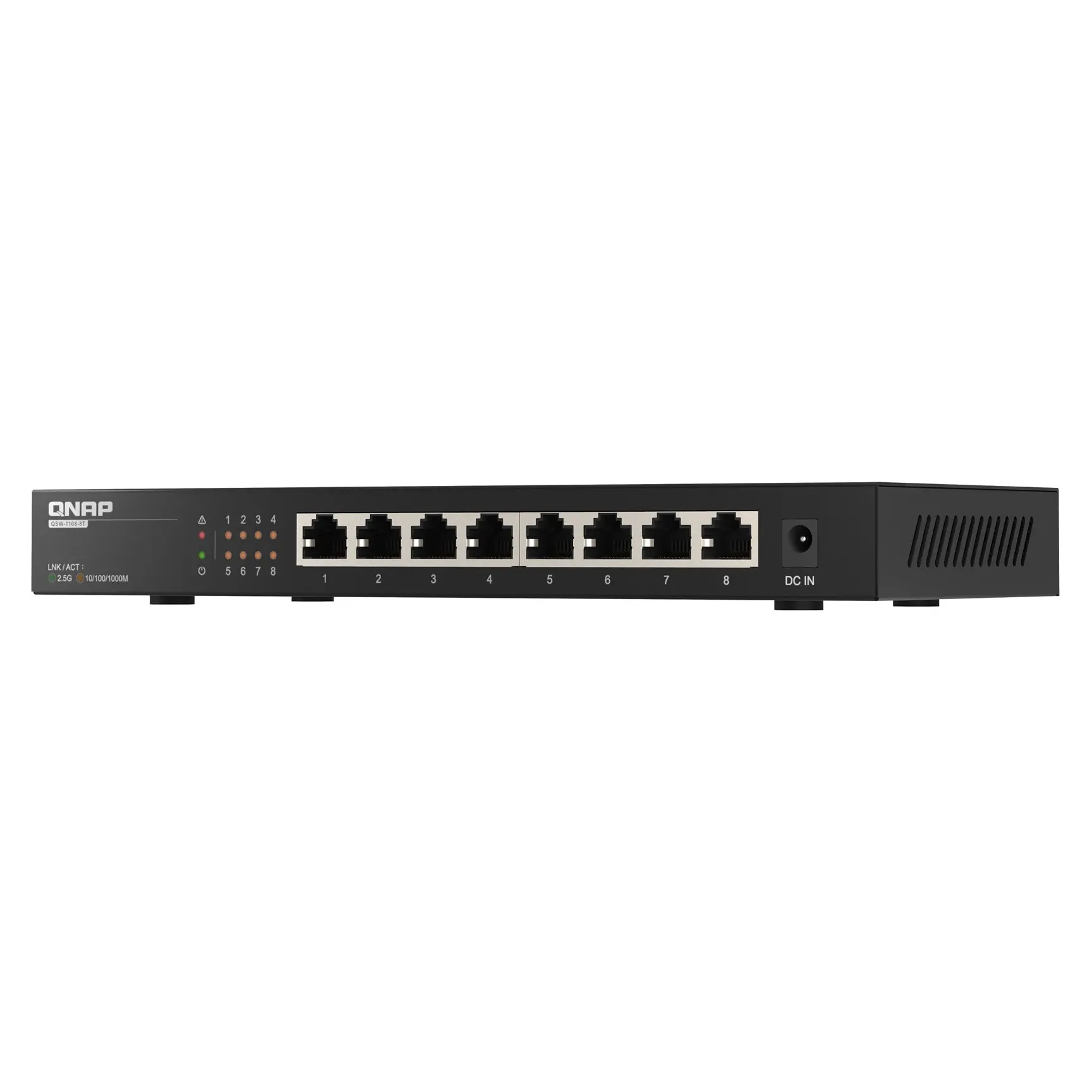 Unleash the potential of your 2.5GbE NAS and computers with a Multi-Gigabit 2.5GbE switch! With eight 2.5GbE ports, the QNAP QSW-1108-8T switch instantly upgrades your network to take advantage of 2.5GbE-enabled devices and NAS without requiring any new network cables. Featuring a near-silent fanless design and plug-and-play set up, the QSW-1108-8T provides network loop detection and blocking functions, making it easy for you to create an affordable high-speed network environment for your home or business.Upgrade your network speed at an affordable priceWith more and more network devices supporting 2.5GbE speeds, traditional Gigabit Switches may be holding back your network performance. The QSW-1108-8T is a cost-optimized high-speed network switch that allows you to take advantage of the growing number of 2.5GbE devices by using existing CAT 5e cables and without stretching your budget.Up to 2.5 times fasterThe QSW-1108-8T has eight 2.5GbE ports that support existing Ethernet devices and are ready for next-generation 2.5GbE devices. Whether you are upgrading your network for business or personal use, the QSW-1108-8T provides a solid foundation for enabling faster and smoother productivity and entertainment.Instantly build a plug-and-play high-speed networkNo complex settings are required to use the QSW-1108-8T - simply connect your devices with existing Cat 5e cables and it’s ready to use. The QSW-1108-8T supports auto-negotiation that optimizes transfer speeds (2.5G/1G/100M) and performance for each connected device.Future-proof your network environmentQNAP offers comprehensive, budget-friendly storage and networking solutions that provide an array of connectivity possibilities. Easily and flexibly upgrade your workplace or home network now to handle bandwidth-hungry applications.Loop detection and blockingThe QSW-1108-8T features network loop detection. If a network loop is detected, the QSW-1108-8T automatically locks the looped ports to ensure the network environment quickly resumes normal operation.Cool and quiet operationThe QSW-1108-8T features a fanless design for near-silent operation. The unique ventilated construction assists in cooling while maintaining high performance.