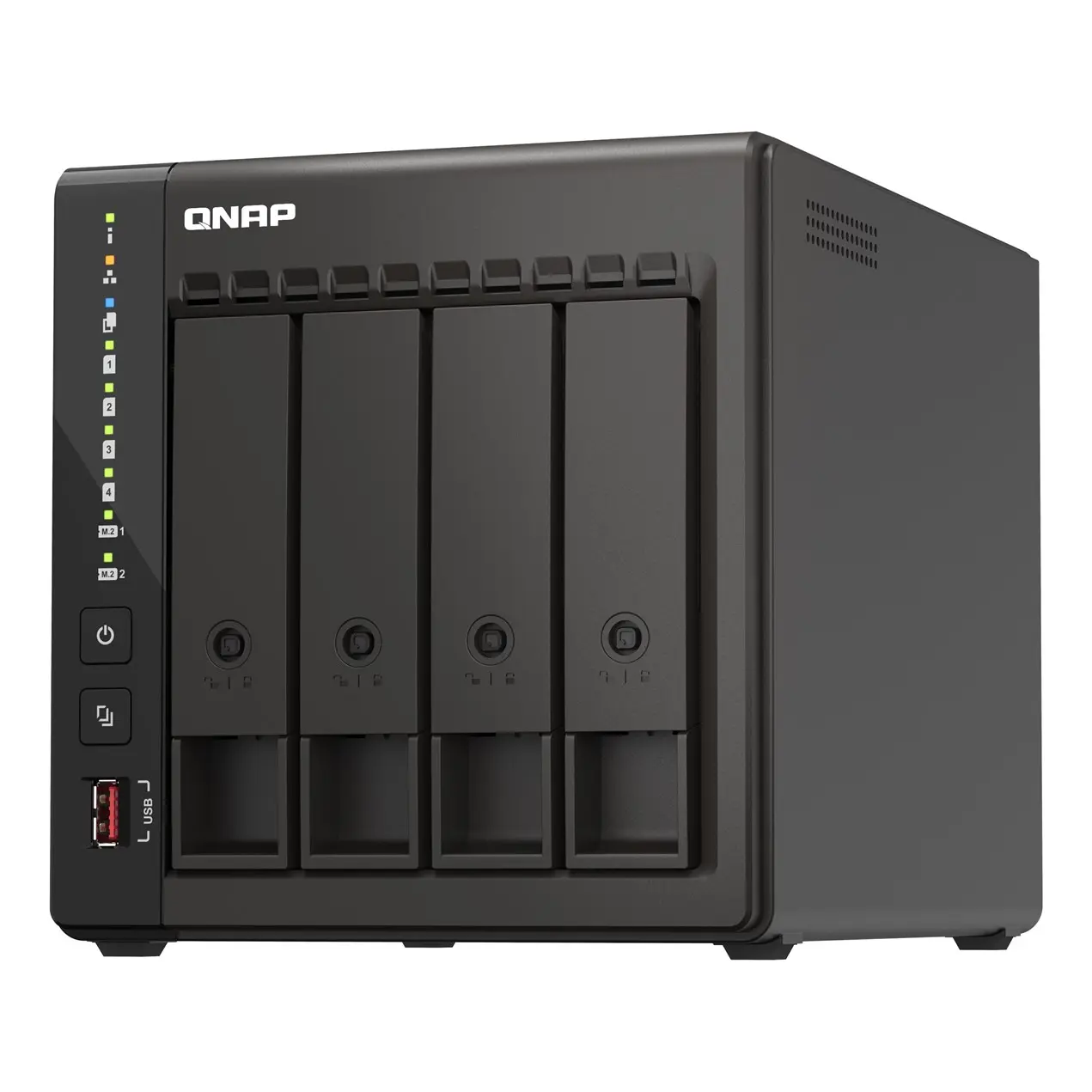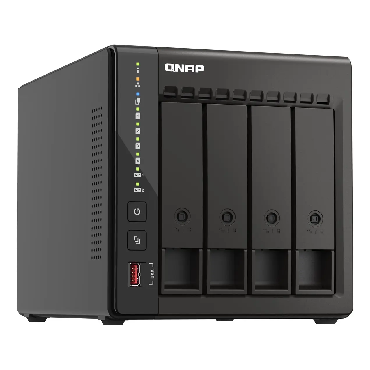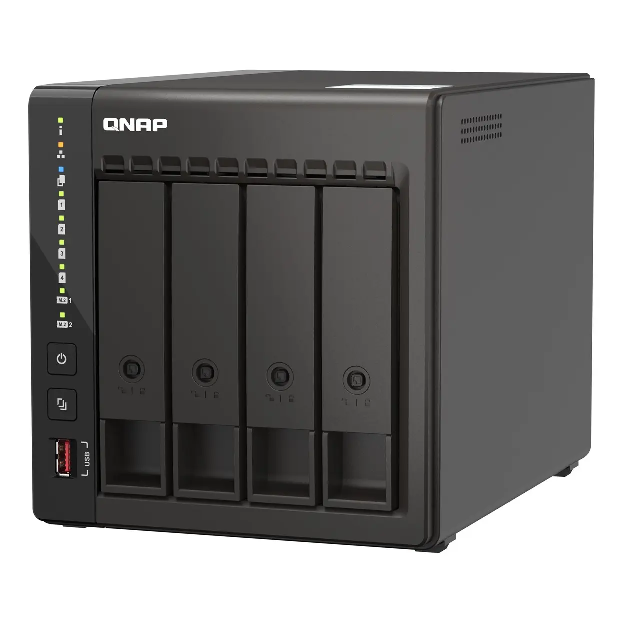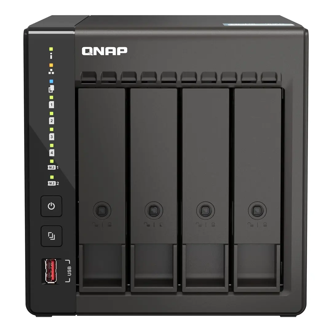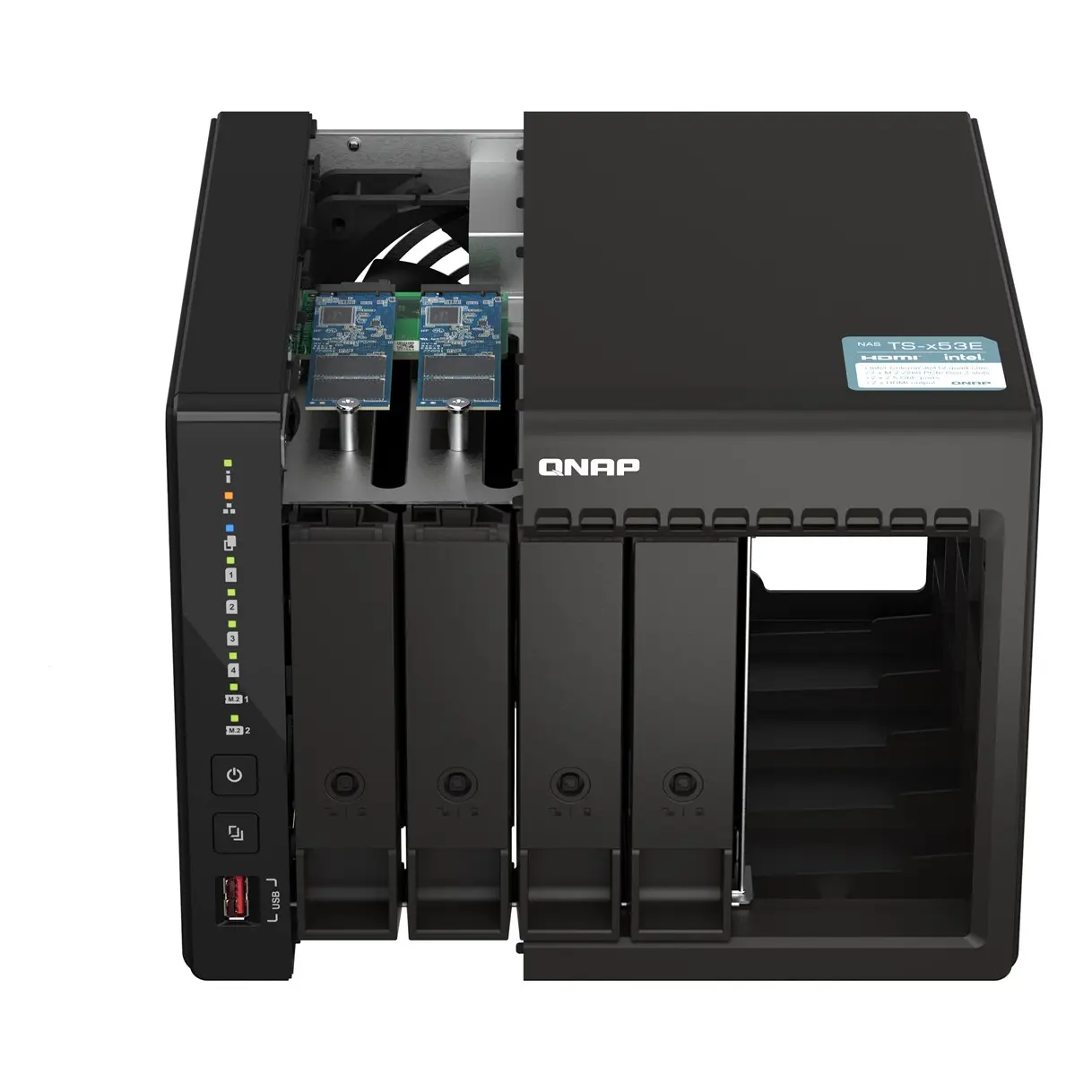 TS-453EDual 2.5GbE, 8GB RAM, and long-term availabilityThe TS-453E features 2.5GbE connectivity, 8GB RAM, and M.2 slots for NVMe SSD caching to deliver high performance for applications such as surveillance systems, virtual machines, file servers or backup servers. Dual HDMI outputs also provide direct multimedia playback and robust surveillance monitoring. QNAP will provide long-term availability and support for the TS-453E, providing a great choice for businesses requiring matching NAS models deployed in multiple locations.ProcessorIntel® Celeron® J6412 quad-core processor (burst up to 2.6GHz)RAMOnboard 8GB (non-expandable)EncryptionThe Intel® AES-NI encryption engine boosts encryption performance while maintaining the confidentiality of NAS data.USB ports• 2 x USB 3.2 Gen2• 2 x USB 2.0Long-term availabilityThe TS-453E is powered by an Intel® Celeron® J6412 processor and will be available and supported for an extended period. This long-term availability makes the TS-453E an ideal choice for MSP, SI, and other IT-related businesses requiring matching NAS models for long-term projects.24/7 surveillance solution for stores and branch officesThe TS-453E is a one-stop surveillance solution for centrally recording/managing multiple cameras and surveillance servers based in your offices, stores, and other workingRecord/monitor your environmentQVR Elite is QNAP’s subscription-based smart surveillance solution, allowing you to easily build a surveillance system with lower TCO and higher scalability. Recordings are saved as MP4 files, allowing playback on nearly every device. QVR Elite also integrates QNAP AI-based solutions to build smart facial recognition for retail and door access systems with QNAP NAS. You can arrange a dedicated, independent storage space for surveillance data on the TS-453E and enjoy simplified camera management, storage space allocation, camera live viewing and playback.Centrally manage up to 32 surveillance serversIf your business requires simultaneously managing multiple recording servers, then install QVR Center on the TS-453E. With QVR Center you can manage up to 32 surveillance servers and 10,000+ cameras with an easy-to-use interface.Faster image identification with integrated Intel® OpenVINO™ AI engine.With integrated Intel® OpenVINO™ AI computing resources, the TS-453E accelerates AI image recognition performance without impacting other applications or services. QNAP AI Core primarily works with the QuMagie application.Transform your network with a wallet-friendly 2.5GbE switchUpgrading your network shouldn’t break the bank, and 2.5GbE connectivity provides immediately noticeable improvements compared to standard 1GbE. QNAP offers 2.5GbE switches that supports Multi-Gigabit NBASE-T™ and allows you to use existing CAT5e cables to connect multiple computers and NAS, assisting organizations in implementing high-speed, secure and scalable network environments without going over budget.Dual 4K HDMI outputs for surveillance monitoring or multimedia displayThe TS-453E supports hardware decoding and real-time transcoding*. The dual HDMI outputs support up to 4K (3840 x 2160p) @30Hz, providing great benefits for applications like surveillance, video production/editing, industrial design and professional photography that demand on-image resolution and color realism as well as intensive media storage, transfer and display.Comprehensive backup and disaster recovery solutionThe TS-453E supports various apps that cover all your backup needs. Practice safe IT habits by regularly backing up files and device content, allowing them to be easily restored when needed.PC/Laptop backupFor Windows®, install NetBak Replicator to back up your PC to QNAP NAS. In macOS®, just set up the built-in Time Machine® to secure your data.Remote backup for NASHybrid Backup Sync makes it easy to back up data from a TS-453E to another QNAP NAS or remote server to fulfill your 3-2-1 backup strategy.VM backupEnjoy license-free VMware® and Hyper-V VM backup with source-side incremental backup, global deduplication, and recovery compression.SaaS backupSafeguard enterprise cloud data by backing up/syncing files, emails, calendars, and contacts from Google™ Workspace and Microsoft® Office 365® to the NAS.Cloud backup for NASHybrid Backup Sync supports mainstream cloud storage for NAS data backup. For backup to object cloud storage, VJBOD Cloud is especially useful to reduce bandwidth usage and backup time.QuDedup technologyHybrid Backup Sync eliminates redundant data at the source and then backs up the deduplicated data, helping to save time and storage costs while providing efficient multi-version backups.WordPress backupEnjoy efficient WordPress backup/restore and site migration by leveraging the user-friendly Multi-Application Recovery Service (MARS), and easily batch backup WordPress files and database to the TS-453E with backup scheduling.Multi-version snapshots mitigate ransomware threatsThe TS-453E supports block-based snapshots that record the state of the system at any time. It helps protect data, which can be restored back to a specific point of time, greatly helping in mitigating the threat of ransomware.Volume and LUN snapshotsTake snapshots in seconds and revert the entire volume/LUN back to a specific point in time to prevent loss of important data.Instantly restore snapshotsSnapshot content can be quickly restored to a local NAS, or restored on a folder/file basis to a local/remote NAS or cloud storage. You can also conveniently view and restore snapshots from the client side.Back up snapshotsMultiply data protection by backing up snapshot files! Replicate volume/LUN snapshots in the TS-453E to a remote NAS (Snapshot Replica) by copying only the changes made. This helps save time & bandwidth, and can be run manually or on a scheduled basis.All-in-one solution for hosting virtual machines and containersBy running multiple virtual machines and containers on the TS-4