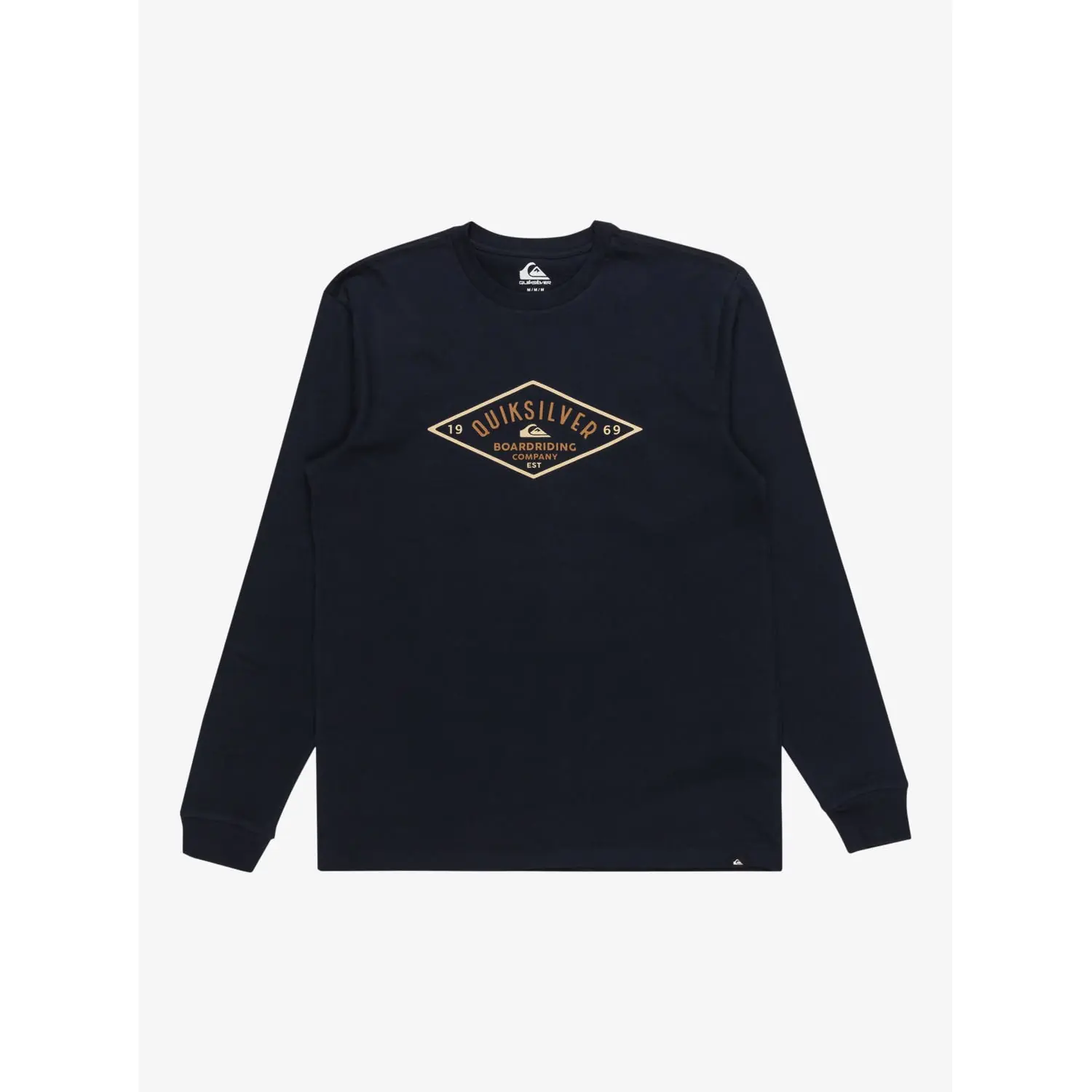 - The T-shirt features a screen print of the Diamond logo on the chest and a Quiksilver woven label at the bottom hem.