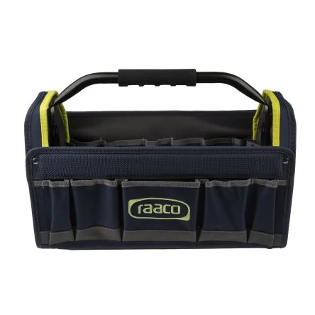 Raaco ToolBag Pro. The ToolBag Pro range from Raaco is a professional range of heavy duty tool bags designed for busy tradesman and contractors. Extremely wear resistant and spacious with a unique design for storing a wide selection of different tools. Large reinforced pockets and lots of them for storing tools and accessories in an organised manner Strong chemical resistant 600D Polyester construction for strength and long life Reinforced metal frame and hard plastic feet to protect against damp and wet surfaces Removable ergonomic shoulder strap designed to reduce strain on the shoulder and a large metal handle with a soft rubber grip for one handed carrying Outside holders for storing tape rolls and measuring tapes so they are always to hand and easy to access Ideal for the contractor who needs easy access to a lot of different tools on site and the DIY expert who wants to hold all his tools in one place