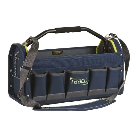 Durable Raaco tool bag with ergonomic shoulder strap for easy access and organization of tools.