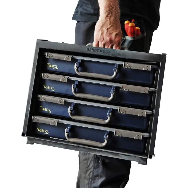 The Raaco HandyBox 55 is a portable storage solution designed to organize and transport small components efficiently. This model includes four Assorter 55 service cases, each offering a variety of compartment configurations to suit different organizational needs.