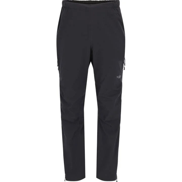 The Men's Firewall Waterproof Pants by Rab are ultralight, durable overtrousers designed for mountaineering and hiking. Constructed with a 3-layer Pertex® Shield fabric, these pants offer waterproof protection, breathability, and a slight stretch for enhanced freedom of movement. Ideal for year-round use, they feature knee articulation for ease of movement and a drawcord at the hem for a secure fit. The pants also include YKK® AquaGuard® double-slider side zips over 3/4 length with internal storm flaps and triple pullers, allowing for quick deployment and ventilation. They are available in sizes XS to XXL and come in black. The weight is approximately 319 grams in size 42.