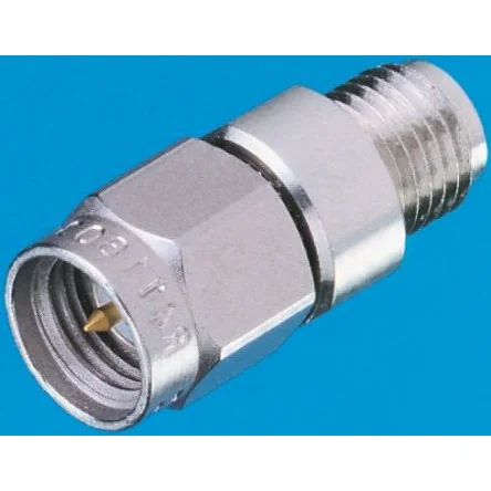 Radiall 50 Ohm SMA RF Coaxial Attenuators. 50 ohm SMA plug to socket RF coaxial attenuators with a PTFE dielectric and gold plated centre contact. 50 ohm SMA attenuators with part number R4118xx124 have a DC 3 GHz operating frequency range, 1 W average power @ 25°C and a nickel plated brass body. 50 ohm SMA attenuators with part number R4118xx121 have an DC 18 GHz operating frequency range, 2 W average power @ 25°C and a passivated stainless steel body. 50 ohm SMA attenuators with part number R4118xx122 have a DC 26.5 GHz operating frequency range, 2 W average power @ 25°C and a passivated stainless steel body.