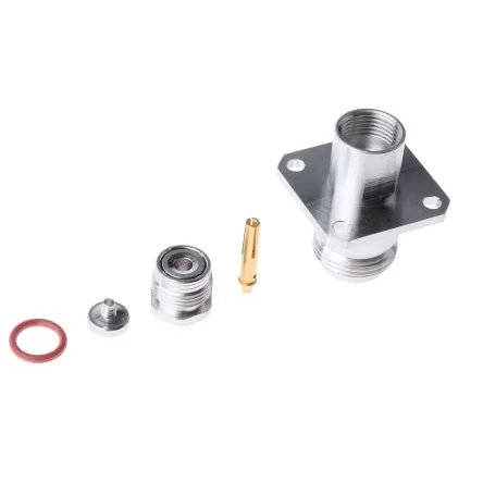 Straight N plugs with square flanges. Straight, female N plugs for fitting with cable gland, equipped with a square flange for panel-mounting. The screw coupling on this connector ensures good HF performance. High permissible power. Mounted using 4 screws - not supplied.