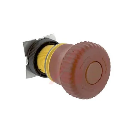 Latching emergency stop push button with a 22.3mm cutout and IP65 rating for reliable performance.