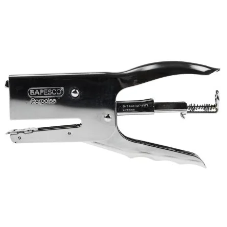 Rapesco StaplerThe Rapesco porpoise plier is a heavy-duty, metal stapling plier with an ergonomic grip for user comfort. This silver plier offers stapling of up to 40 sheets of 80gsm paper. It offers easy reloading with its rear spring-loading mechanism.Features and Benefits• Adjustable anvil for stapling and pinning • Contoured handle for user comfort • Uses Rapesco 26mm and 24/6-8mm staplesApplications• Cardboard and jiffy bags • Educational purposes