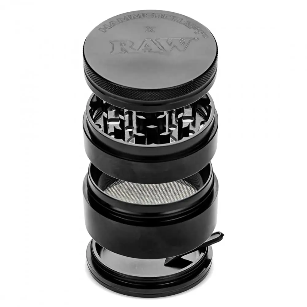 discover the raw x hammer craft grinder in black aluminum an exceptional grinding tool designed to meet the needs of the most demanding users. with a diameter of 55 mm and a height of 45 mm this grinder offers generous grinding capacity. made of anodized aluminum according to aeronautical standards it combines durability and lightness. featuring diamond-shaped teeth a magnetically attached lid and a 4-compartment structure with polinator filter this grinder guarantees an optimal grinding experience. comes with a scraper included it comes in stylish cardboard packaging.