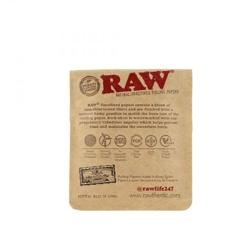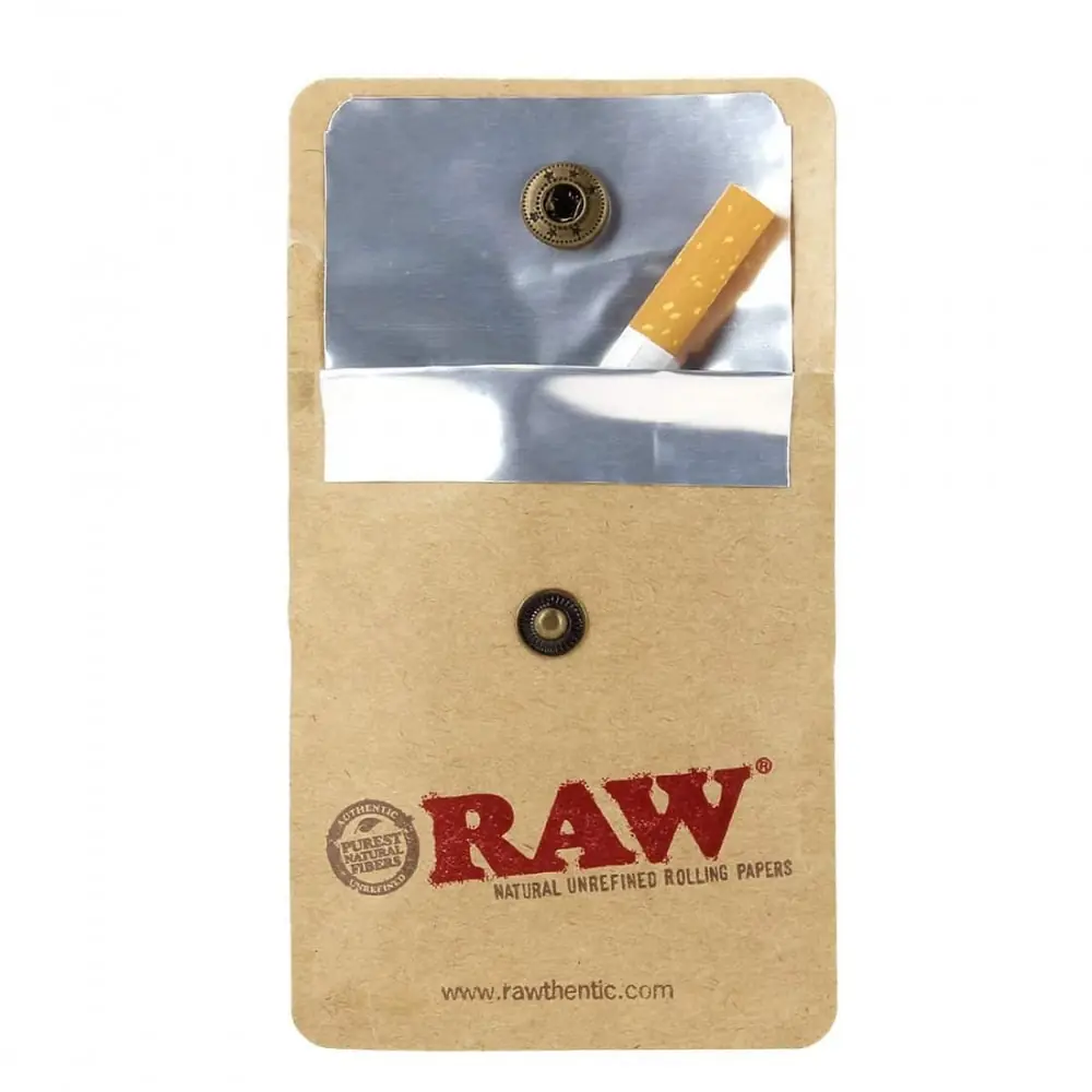 practical and discreet raw brand portable ashtray with snap button closure and aluminum lining.