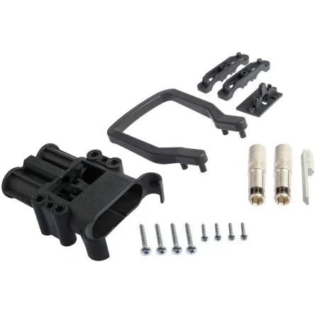 EN 1175-1; DIN 43589, 150V. High Current Connector. A connector system designed specifically for electrically operated industrial vehicle battery and charging operations. The connectors come complete with solder contacts, cable clamp, mounting screws and polarising key. The polarising key can be used in 6 different orientations depending on your voltage requirement. The voltage is then displayed through the connector housing, (24 V, 36 V, 48 V, 72 V, 80 V, 96 V). All models are highly reliable and excellent quality. Features ; Benefits. • A choice of 80A or 160A current capability • Offers a service voltage up to 150 V • Plug and socket housing can be mounted directly to the chassis • Socket housing has a handle for ease of mating and unmating
