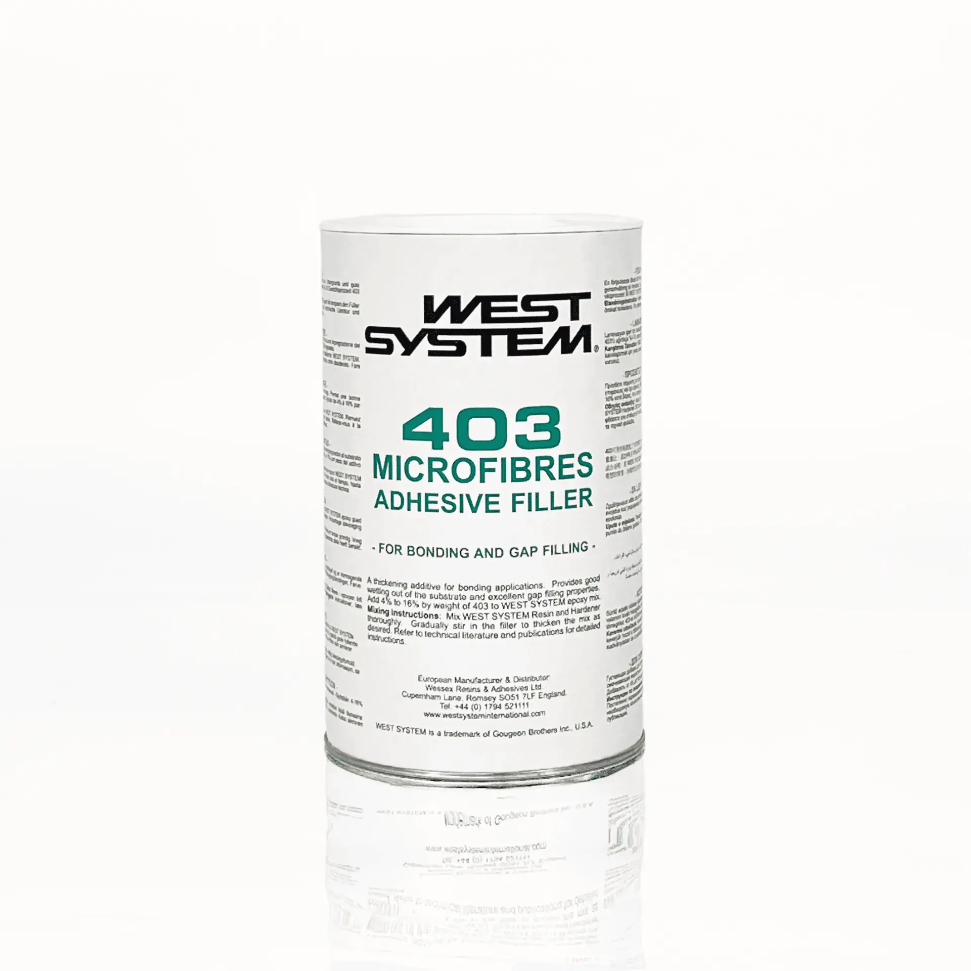 WEST SYSTEM's 403 Microfibres filler is used to thicken an epoxy/hardener resin mixture and create a versatile adhesive.