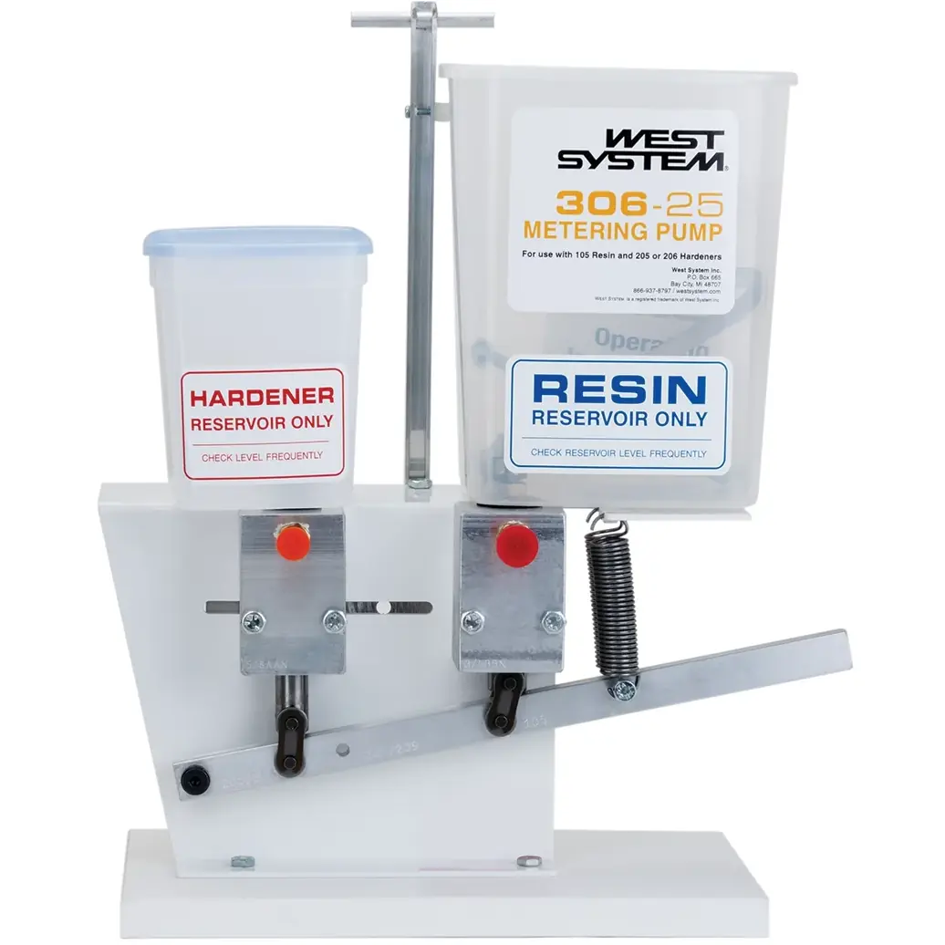Dosing pump for measuring large quantities of resin 105 and hardener 205 and 206 (5:1 ratio).