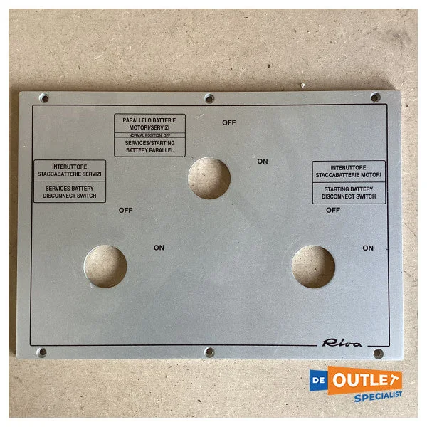 The Riva battery switch panel plate silver is a switch panel for the electrical systems of boats and yachts. The panel is made of high-quality silver-coloured metal and has an elegant appearance that fits well with most interiors. The panel is designed for use with a Riva battery switch, which is not included with the panel and must be purchased separately. The panel is suitable for use with 12V or 24V DC systems and has two switches, one red and one black, which allow the electrical systems of the boat to be turned on or off. The panel comes with a mounting kit, making it easy to install on a flat surface, such as a dashboard or console. The dimensions of the panel are 7.5 cm by 5.5 cm, making it a compact and space-saving option for small boats or yachts. In short, the Riva battery switch panel plate silver is a high-quality switch panel that combines an elegant appearance with ease of use and reliability.