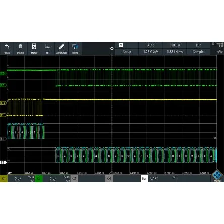 Rohde ; Schwarz RTB2000 Digital Oscilloscopes. The Rhode ; Schwarz RTB2000 series digital oscilloscopes offer the Power of ten: 10-bit ADC, 10 Msample memory and 10.1 inch colour touchscreen. These features ombined with smart operating concepts make the R ;S®RTB2000 series the perfect tools for university laboratories, for troubleshooting embedded designs during development and for production and service departments. This series of oscilloscopes offer the largest (10.1 inch) capacitive touch display with the highest resolution of 1280 x 800 pixel in its class. The touch screen allows quick navigation in pop-up menus, easily adjust scaling, zoom in or to move a waveform and even annotate the display and take screenshots. It works just like your smartphone touch screen. The R ;S®RTB2000 series give users more than just an oscilloscope. It also includes a logic analyser, protocol analyser, waveform and pattern generator and digital voltmeter. Dedicated operating modes for frequency analysis, mask tests and long data acquisitions are also integrated. Debugging all kinds of electronic systems is easy and efficient. Features. 10 bit vertical resolution 1 mV/div: full measurement bandwidth and low noise 10Msample standard and 20 Msample interleaved Segmented memory: 160 Msample with history 10.1 inch high resolution capacitive touch screen with gesture support On-screen annotation function by using your finger with screen-shot capture Fast access to important tools Education mode disables automatic functions for more manual control Multilingual support. Mixed signal operation option (model dependant, also any oscilloacope can be upgraded to MSO with the RTB-B1 MSO option (RS 143-9334). Oscilloscope Choice:. ; 143-9311 143-9311 RTB2002, 70 MHz, 2ch. ; 143-9312 143-9312 RTB2002, 70MHz, 2ch, MSO. ; 143-9313 143-9313 RTB2004, 70 MHz, 4ch. ; 143-9315 143-9315 RTB2004, 70 MHz, 4ch, MSO. ; 143-9316 143-9316 RTB2002, 100 MHz, 2ch. ; 143-9317 143-9317 RTB2004, 100 MHz, 2ch, MSO. ; 143-9318 143-9318 RTB2004, 100 MHz, 4ch. ; 143-9319 143-9319 RTB2004,100 MHz,4ch, MSO. ; 143-9321 143-9321 RTB2002, 200 MHz, 2ch. ; 143-9322 143-9322 RTB2002, 200 MHz, 2ch, MSO. ; 143-9323 143-9323 RTB2004, 200 MHz, 4ch. ; 143-9324 143-9324 RTB2004, 200 MHz, 4ch, MSO. ; 143-9325 143-9325 RTB2002, 300 MHz, 2ch. ; 143-9326 143-9326 RTB2002, 300 MHz, 2ch, MSO. ; 143-9327 143-9327 RTB2004, 300 MHz, 4ch. ; 143-9328 143-9328 RTB2004, 300 MHz, 4ch, MSO. Growth Potential. The Rohde ; Schwarz RTB2000 oscilloscopes can be adapted by the installation of software updates. These updates apply to triggering and decoding of serial protocols and the history and segmented memory mode. The waveform and pattern generator and the MSO capabilities (model dependent, see below) are built-in and just need to be activated. The bandwidth can be upgraded up to 300MHz making functional retrofitting very easy. Bandwidth Upgrades:. ; 143-9336 143-9336 RTB-B221 Upgrade 100 MHz for RTB2002 ; 143-9337 143-9337 RTB-B222 Upgrade 200 MHz for RTB2002 ; 143-9338 143-9338 RTB-B223 Upgrade 300 MHz for RTB2002 ; 143-9339 143-9339 RTB-B241 Upgrade 100 MHz for RTB2004 ; 143-9340 143-9340 RTB-B242 Upgrade 200 MHz for RTB2004 ; 143-9341 143-9341 RTB-B243 Upgrade 300 MHz for RTB2004. Trigger and Decode. ; 143-9329 143-9329 RTB-K1 I2C/SPI Trigger ; Decode ; 143-9330 143-9330 RTB-K2 UART/RS232 Trigger ; Decode ; 143-9331 143-9331 RTB-K3 CAN/LIN Trigger ; Decode. History and Segmented Memory. ; 143-9332 143-9332 RTB-K15 History ; Segmented Memory. Software Option Bundle. ; 143-9333 143-9333 RTB-PK1 Software Option Bundle. Mixed Signal Option. ; 143-9334 143-9334 RTB-B1 Mixed Signal Option. Function Generator. ; 143-9335 143-9335 RTB-B6 Function Generator. Front Cover and Carry Case. ; 143-9342 143-9342 RTB-Z1 Front Cover. ; 143-9343 143-9343 RTB-Z3 Carrying Case