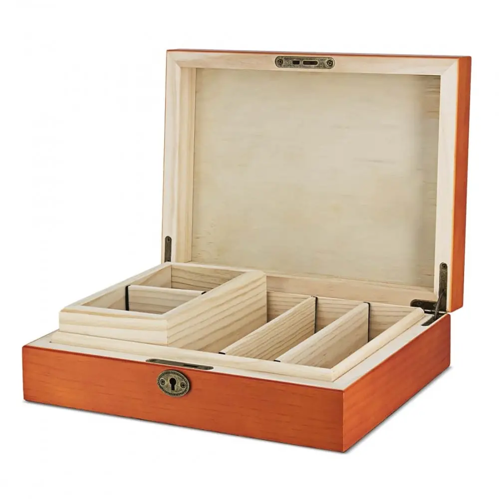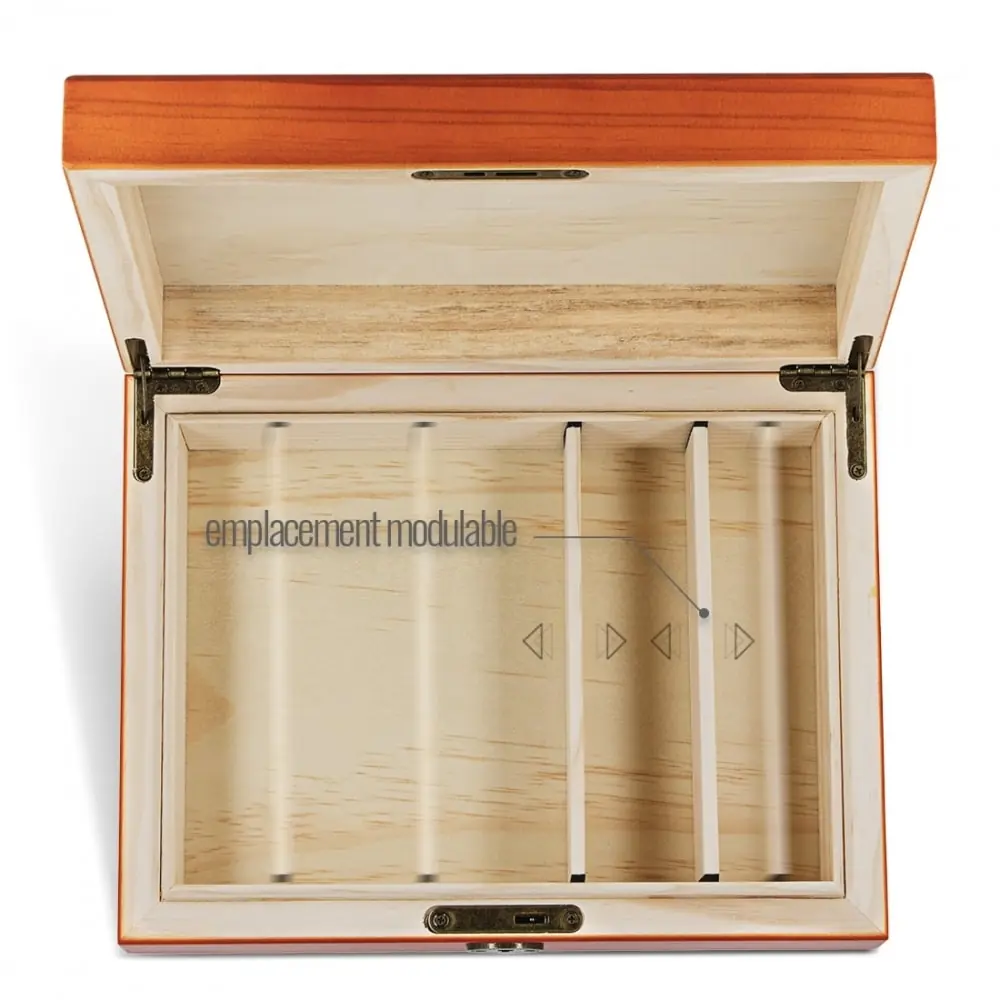 the rolling supreme wooden storage box orange size l is the ideal accessory to organize your smoking accessories. it includes dividers for optimized storage an internal box with sieve and glass plate to collect pollen and a key to secure your belongings.