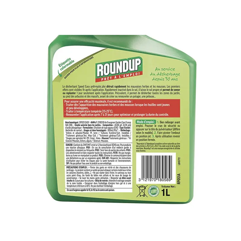 Thismulti-purpose ROUNDUP herbicide - 1L is a herbicide that eliminates moss and weeds on contact. This product is used without prior preparation and in all areas of the garden. Weed at the base of shrubs or flower beds before creating or renewing a vegetable garden or lawn; you can sow or replant 1 day after application. The first results are visible in just 1 hour.