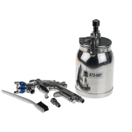 RS Pro Spray Gun. A high-quality air spray gun from our own RS Pro brand, this gun is ergonomic, compact, easy to use and lightweight. Using 50 psi of air pressure the RS Pro spray gun can spray paint from the quick release container up to 240 mm in distance. With a convex, dust-free air cap design, the build-up of paint in the nozzle is eliminated which helps reduce costly maintenance time. The spray gun also benefits from a fan pattern for optimal efficiency leading to savings on air consumption and paint material. The spray gun has an all-metal construction which makes it easy to strip for cleaning. Ideal for spray painting in general and industrial applications. Features and Benefits. 1/4" BSP Connection. 2 mm Nozzle. Fast application speed. Superior atomization and finishing result. Compatible with most solvent-based and water-based substances. Manufactured to an industrial standard. All metal construction