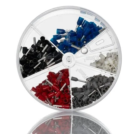 RS PRO 400 Piece Bootlace Ferrule Kit, 0.5 to 2.5mm ;sup>2 ;/sup>. From RS PRO a handy crimp terminal kit containing an assortment of 400 high-quality DIN 46228 standard colour coded insulated bootlace ferrules (also known as cord end ferrules or wire end ferrules). These wire ferrules range from size 0.5 mm² through to 2.5 mm² and are stored in separate compartments within a clear circular box for easy selection. This kit is portable and ensures you are equipped with all the necessary terminal sizes when it comes to terminating conductors wherever you are working. What Is a Bootlace Ferrule?. A bootlace ferrule is a metal tube or ferrule with a moulded colour coded insulating collar made from plastic. The ferrule is slipped over the end of a multi-stranded wire or cable, crimped and then inserted into a screw or spring clamp connection. Where is a Bootlace Ferrule Used?. When the end of a multi-stranded wire is stripped and placed directly under a screw terminal the strands of the wire will naturally fan out under the pressure of the screw. Some strands will go astray. This reduces the quality of the electrical connection and can also result in electrical shorts. When a bootlace ferrule is used, the insulated funnel with it's flared design captures all the strands. These strands are then crimped together in the ferrule tube. The crimped ferrule is then inserted into the terminal to create an electrical connection. Features and Benefits. Colour coded insulation for easy ferrule size identification Excellent electrical connection Crimped terminal can be repeatedly inserted and removed from connection without degrading end of the wire Transparent plastic circular box for portable, compact and uncluttered storage 5 marked compartments sorted by size for ease of selection. Application information. Bootlace ferrules are used on multi-stranded wires that are being inserted into screw terminals and terminal blocks. Applications include consumer units, circuit breakers, electrical control panels and any equipment where there is a requirement for a multi-stranded wire connection. Questions and Answers. How to Crimp a Bootlace Ferrule. Select the correct size bootlace ferrule and strip the end of the wire. Cut the wires to the same length as terminal and twist the strands together. Slip the bootlace ferrule (insulated collar first) onto the ends of the wire until the wire strands are flush with the end of the tube. Using a ratchet crimping tool or ferrule crimper, insert the metal tube of the ferrule into the appropriate crimping section (indicated by sizes marked on the tool). Squeeze the tool handles together until the ratchet releases. A ratchet crimping tool is preferable as the handles will remain locked until a full crimp cycle is completed preventing partial crimps. The crimped wire end is now ready to be inserted into connecting terminal. Suitable Crimping Tools. Suitable ratchet crimp tool for 0.25 to 6 mm ;sup>2 ;/sup> see stock number ; 683-1605 683-1605 Suitable plier crimp tool for 0.5 to 16 mm ;sup>2 ;/sup> see stock number ; 464-482 464-482