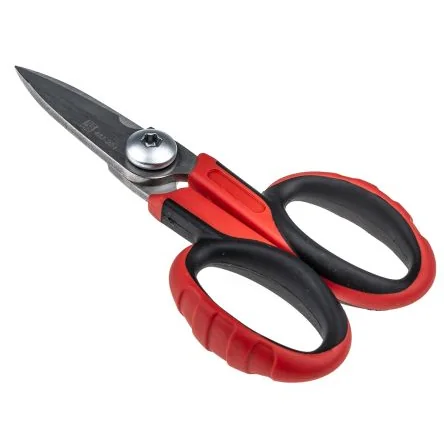 RS PRO Electricians Scissors. Our RS PRO heavy-duty, stainless steel electricians scissors with a notch are ideal for electricians out in the field whilst working. These scissors can sometimes be referred to as "cutters" or "shears", they have been designed to seamlessly cut through hard materials such as cloth, upholstery, leather, kevlar and insulation. Features ; Benefits. Constructed from chrome steel, the serrated blades have been hardened to allow them to trim kevlar strength members The alloy steel pivots, allowing it to be adjustable - dependable on application Bevelled and precision ground for long-lasting sharpness and cutting performance The handles have been ergonomically designed to promote ease of use and comfort when being handled - this design also contributed to the balance, control and reduction of strain and fatigue The scissors have been vacuum treated to HRC 58-60 (only on the scissor blades) 138mm overall length Features a hollow grounding, cutting edge - fully polished finished on the whole body The majority colour of the electrician's scissors is red Micro-serration cutting length 42 mm (1-5/8") and thickness of blade 3.2mm. RS PRO. RS PRO is our own brand range and brings you a wide range of high-quality, great value products offering you more choice. Trusted by engineers all over the world, every part of every RS PRO product has been rigorously tested against demanding industry standards; they ‘re only given the RS PRO seal of approval if we ‘re confident of their exceptional quality, which means you can be confident too.