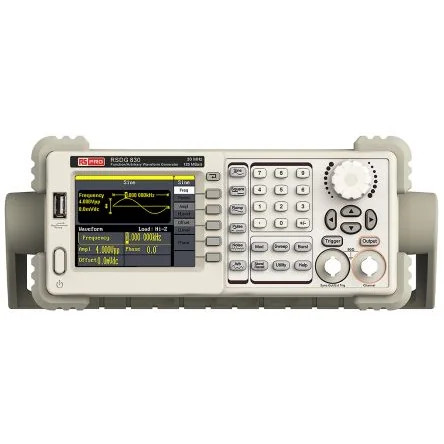 Quick start guide, CD(including EasyWave computer software system), power cord, USB cable. 3. RS Pro RSDG800 Series Function/Arbitrary Waveform Generators. RS Pro RSDG800 Series function/arbitrary waveform generators output Sine, Square, Ramp, Pulse, Noise and Arbitrary waveform functions. The RSDG800 models are powered with EasyPulse technology which produces low jitter, fast rising/falling edges unaffected by frequency, even at low duty cycle settings. The advantage is that the operator has a wide range of pulse widths and transition times. This results in a more versatile generator than similar DDS designs. Features and Benefits. DDS technology, single-channel output 125 MSa/s sample rate, 14 bit vertical resolution 5 types of standard output waveform, built-in 46 arbitrary waveforms Complete set of modulation functions: AM, DSB-AM, FM, PM, FSK, ASK, PWM, Sweep, Burst Input/output - waveform output, synchronous signal output, external trigger input Standard interfaces USB Device, USB Host Supplied with powerful arbitrary editing software Support remote control Dimensions 229 x 105 x 281 mm Weight 3.4 kg. Areas of Application. Analog sensor Simulation environment signals Circuit function test IC test Research ; Development Training