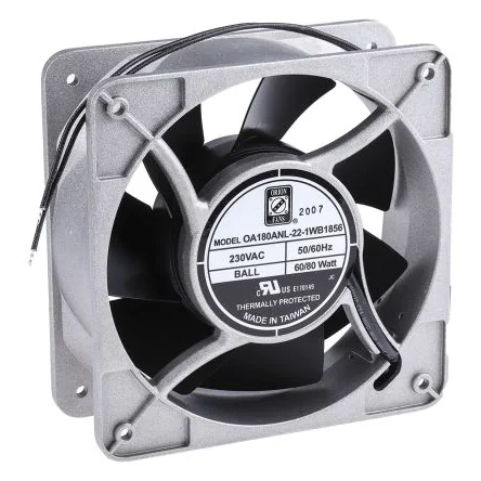 RS PRO, 230 V AC, Axial Fan, 180 mm x 180 mm x 65 mm, 679.6 m³/h, 80 W, IP56Designed to keep your electronic and IT equipment cool, the RS PRO axial fan protects components from breakdowns caused by overheating. This product benefits from a hardwearing dual ball double-sealed bearing system to increase longevity. For added convenience, fans with ball bearings can be mounted in any axis position allowing air to be pushed down and drawn in from different directions for more efficient ventilation. Featuring a backward curve, this axial fan is best suited to environments in need of a medium air-flow. It will typically provide 60,000 hours of service and has an IP56 rating, meaning its protected from limited dust ingress, as well as high-pressure water jets from any direction. Youll primarily find fans such as these used in commercial and industrial settings to cool electrical cabinets and server rooms.Features and Benefits• Dimensions of 180 mm (H) x 180 mm (W) x 65 mm (D) • Supply voltage of 230 V AC • Power consumption of 80 W • Airflow of 679.6 m³/h • Noise level of 65 dB • Fan speed of 3250 rpm • Backward curve for medium airflow • Ball-bearing system • IP56 rated for protection against limited dust ingress and high-pressure water jetsRS PRORS PRO is our own brand range and brings you a wide range of high-quality, great value products offering you more choice. Trusted by engineers all over the world, every part of every RS PRO product has been rigorously tested against demanding industry standards they’re only given the RS PRO Seal of Approval if we’re confident of their exceptional quality, which means you can be confident too.