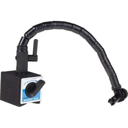 RS PRO Magnetic Base Stand with Snake Arm. The RS PRO magnetic base features a flexible arm which can be locked in any position by a single lever. It is fitted to a switchable magnetic base which has a 40 kg (400N) pull. It will hold plunger or lever indicators with stems/spigots between 3 to 13 mm in diameter. The bases are magnetic so that they can be attached to metal surfaces securely without the need for screws. RS PRO bases and arms are a type of accessory and are ideal for use in test and measurement applications for both commercial and professional users. Features and Benefits:. ;ul> ;li>Magnetic base indicator stand with flexible arm ;/li> ;li>Overall length of snake arm is 330 mm ;/li> ;li>Base has on / off switch ;/li> ;li>Magnet base dimensions 50 x 60 x 55 mm (W x L x H) ;/li> ;li>M8 arm thread into the magnetic base ;/li> ;li>Magnetic base can be attached in various positions to help with precision measurement ;/li> ;li>Supports plunger dial and lever indicators ;/li> ;/ul>. Typical Applications. Bases and arms are extremely useful instruments and are used within various applications including: General workshop inspection Maintenance
