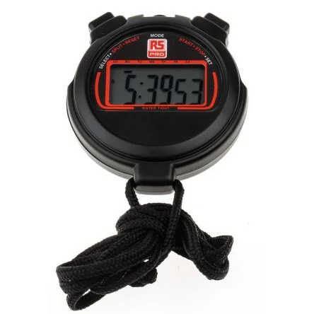RS PRO Digital Pocket Stopwatch. Introducing the pocket stopwatch from our trusted and reliable own brand RS PRO, a compact 1/100 second LCD stopwatch with lap facility, normal time, alarm and calendar features. This pocket sized stopwatch features an LCD screen allowing you to view results clearly in real time, with 12 mm and 10 mm digit heights. From the time start, this stopwatch counts to 40 minutes in 1/100 second and then to 24 hours in 1 second intervals, including accuracy within 2 second over 24 hours. This RS PRO digital stopwatch operates via a 3 volt operating system with 2032 lithium battery, offering increased reliability and accuracy. This reliable timer is enclosed in a stylish black water resistant case with a cord lanyard, making it ideal for use indoor and outdoor in a range of applications. Features and benefits. • Stylish black water resistant plastic case, making it ideal for use in a range of applications • Clear LCD screen to display results with ease • Large 12mm and 10mm digit heights • Normal time, calendar, alarm and lap facility • Accuracy within 2 second over 24 hours • 5 year battery life under normal use, providing a long lasting and reliable device • 1/100 second resolution • Counts up to 40 minutes in 1/100 second and then to 24 hours in 1 second intervals. Applications. Stopwatches are suitable for a wide range of applications that require a way of measuring the elapsed time of a task or activity. They are available as either digital or analogue devices, depending on the application required. These devices are commonly used in: • Sporting events • Competitions • Tests and experiments • Live events. What batteries does this require?. This timer from RS PRO uses a 3 volt operating system with a coin (CR2032) lithium battery with an average life of 5 years under normal use from the start, offering an enhanced and reliable timer. What is the maximum time achievable?. The maximum time achievable for this stopwatch is 24 hours. Does it feature an alarm?. This pocket sized stopwatch from RS PRO features an audible alarm, enhancing the notification experience.