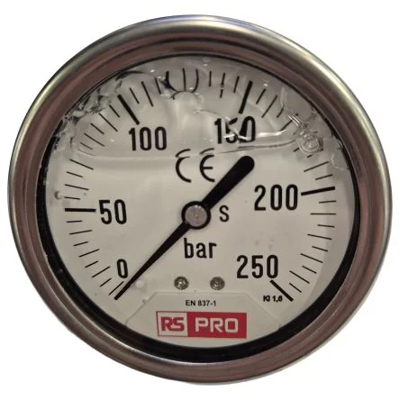 The RS PRO Analogue Pressure Gauge measures up to 250bar with a durable stainless steel case.