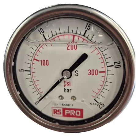 The RS PRO Analogue Pressure Gauge measures up to 25bar with a 63mm diameter and bottom entry connection.