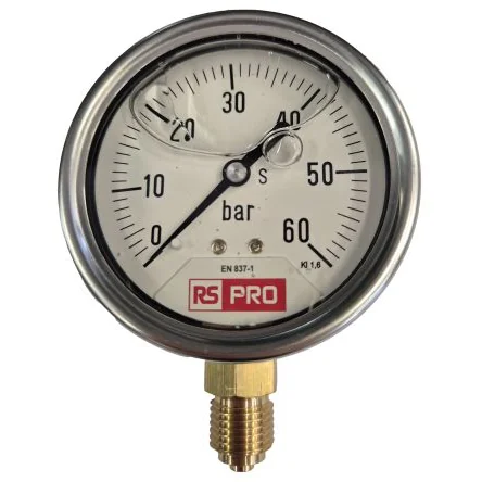 The RS PRO Analogue Pressure Gauge features a 60bar capacity and a durable stainless steel case for reliable pressure measurement.