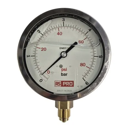 The RS PRO Analogue Pressure Gauge measures up to 6bar, featuring a 100mm diameter and bottom entry design.