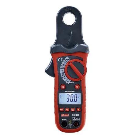 RS PRO Mini AC/DC Clamp Meter The mini AC/DC clamp meter from RS PRO is a highly reliable device designed to verify the presence of electrical parameters such as load current, voltage, resistance and more. The small design of the meter and jaws make this device ideal for hand held operation and working on the go, with a large back lit display for enhanced readability. The RS PRO mini clamp meter offers a wide measurement range from a very small to large current, providing a powerful yet versatile device. The RS mini AC/DC clamp meter features a test lead mA range with high 1 mA resolution for HVAC and process control applications data. This durable true RMS clamp meter also includes an auto power off feature to preserve battery life and a data hold function, allowing you to freeze the meter reading on the LCD screen. Features and benefits • Compact design ideal for working on the go • Auto power off function to preserve battery life • Large back lit LCD display screen • Data hold function to freeze meter readings • Test lead mA range with high 1 mA resolution for HVAC and process control applications data • Wide measurement range • Ideal for measuring various functions such as AC Current, AC Voltage, Capacitance, Continuity, DC Current, DC Voltage, Diode, Duty Cycle, Frequency, Resistance, Temperature • Safety category level: CAT III 600V • True RMS Applications Clamp meters are an electrical test tool used to measure electrical characteristics such as AC current, AC and DC voltage, resistance, continuity and more. Clamp meters are often a combination of a basic digital multimeter and a current sensor, offering a versatile electrical measurement tool. Clamp meters are commonly used by: • Industrial maintenance technicians • Control technicians • Electricians – in-house and contractors • Facilities, building maintenance and HVAC technicians • Service organisations FAQs What battery does this require? The RS PRO mini AC/DC requires a 9V battery for operation. What is the maximum opening on the jaw? The maximum opening of the clamp jaw is approximately 19 mm.