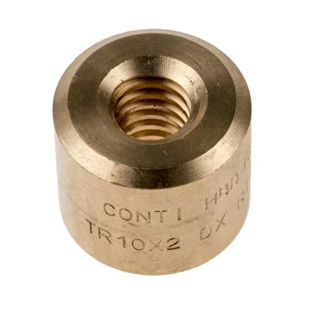 RS PRO Lead Screw Round Nuts. Make your lead screw projects a breeze with RS PRO round nuts. Our round nuts are designed for maximum performance and minimal friction, with internal threads that match the threads on trapezoidal lead screws for effortless movement. With lubricated bronze material, you can rest assured that RS PRO round nuts will reduce wear on lead screws and make your projects that much easier. Get maximum precision with minimum friction. Why Would You Choose These Round Nuts. Our round nuts are high-quality, cylindrical bronze nuts for trapezoidal lead screws. They have a single start thread and are suitable for applications with modest loads. Regular lubrication is recommended to ensure consistent operation. Features and Benefits. ;ul> ;li>Round nuts ;/li> ;li>Minimal friction ;/li> ;li>Achieve accurate, repeatable motion ;/li> ;li>High degree of control and precision ;/li> ;li>Material: Bronze ;/li> ;li>Thread Starts: 1 ;/li> ;li>For use with trapezoidal lead screws ;/li> ;/ul>. RS PRO Round Nuts Shaft Diameter Variants – Available Separately. ;ul> ;li>10 mm, RS stock no: ; 862-5345 862-5345 ;/li> ;li>12 mm, RS stock no: ; 862-5354 862-5354 ;/li> ;li>14 mm, RS stock no: ; 862-5357 862-5357 ;/li> ;li>16 mm, RS stock no: ; 862-5351 862-5351 ;/li> ;li>18 mm, RS stock no: ; 862-5360 862-5360 ;/li> ;li>20 mm, RS stock no: ; 862-5363 862-5363 ;/li> ;li>22 mm, RS stock no: ; 862-5367 862-5367 ;/li> ;li>24 mm, RS stock no: ; 862-5376 862-5376 ;/li> ;/ul>. Applications. ;ul> ;li>CNC machines ;/li> ;li>3D Printers ;/li> ;/ul>