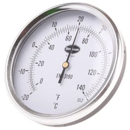 Centre Back and Vertical 100mm Diameter Immersion Thermometers. Bi-metal element thermometers with applications in the heating and ventilation process, and refrigeration industries Dual scale Acrylic Window Temperature range covers both hot ; chilled water applications Manufactured to DIN 16203 1/2 in. BSP Brass Male Thread Vertical entry types: ; 324-8384 324-8384 , ; 324-8413 324-8413 , ; 324-8407 324-8407 , ; 324-8429 324-8429